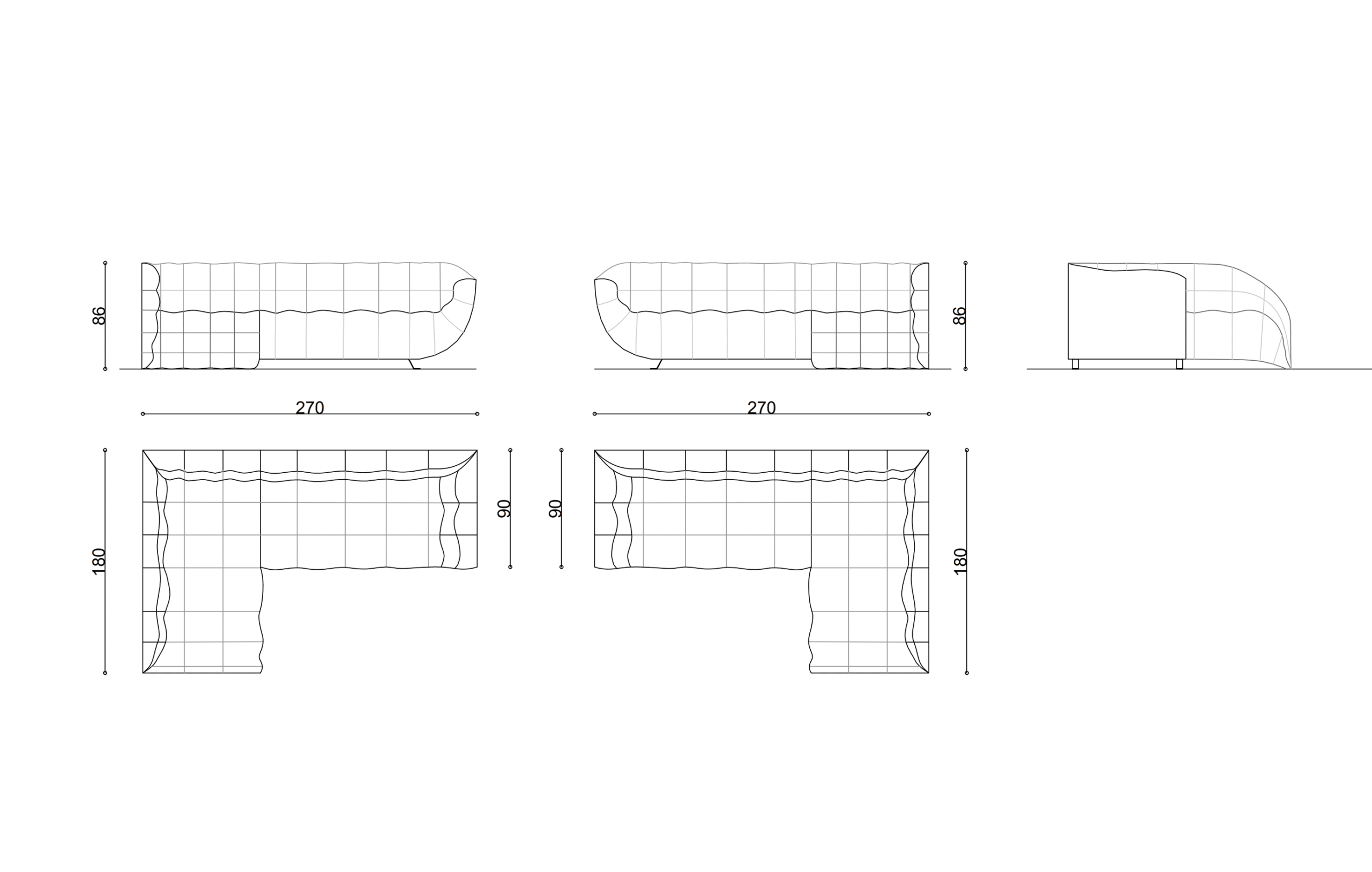 Dimenzije garniture su 270 cm x 180 cm x 86 cm, ali se može naručiti u više boja i tkanina.