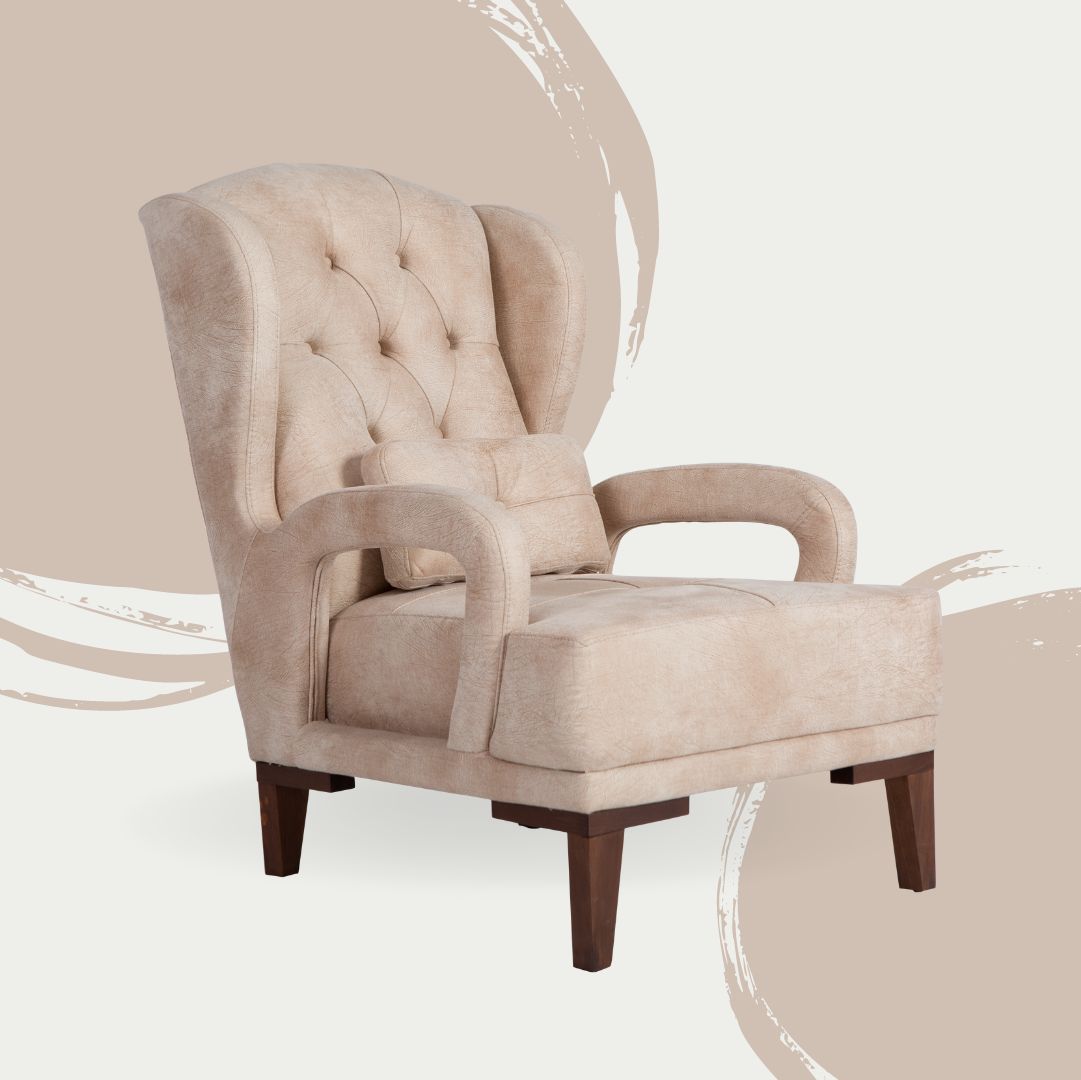Elegantna fotelja u retro stilu sa povišenim nogama od punog drveta.