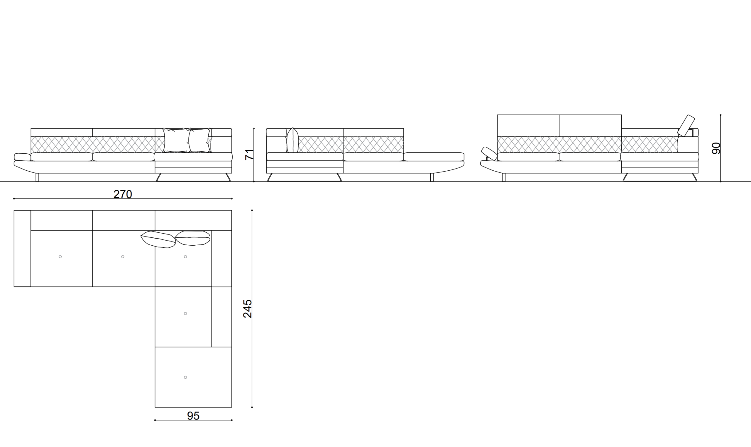 Dimenzije garniture su 270 cm x 245 cm x 71 cm, može se naručiti u više štofova i boja kao i u pravoj koži (PALERMO kutna garnitura - KOŽA).